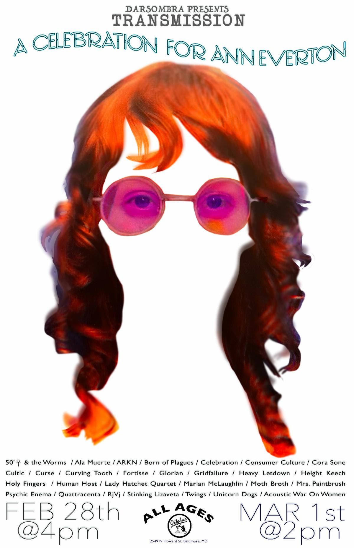 Preceded by a gathering for family and friends, DARSOMBRA Presents: Transmission – A Celebration For Ann Everton will feature two full days of performances on both the upstairs and downstairs stages at the Ottobar. A large contingent of the acts are friends located across the Baltimore area, with some of the highlights including Acoustic War On Women, Curse Consumer Culture, Moth Broth, 50’