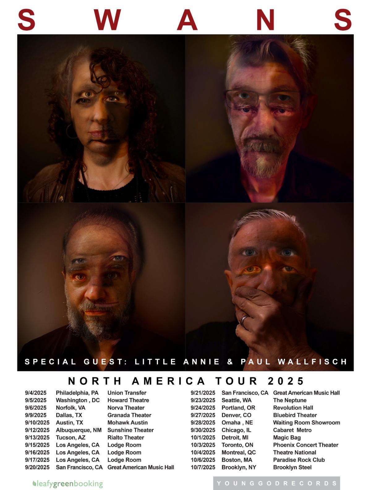 SWANS, who's seventeenth studio album, Birthing, is scheduled for release on May 30th via Young God Records/Mute, have revealed dates their first North American tour in support of release. The trek will lauch on September 4th in Philadelphia and wrap up October 7th in Brooklyn. Little Annie & Paul Wallfisch will provide on all dates.Check the full routing below.